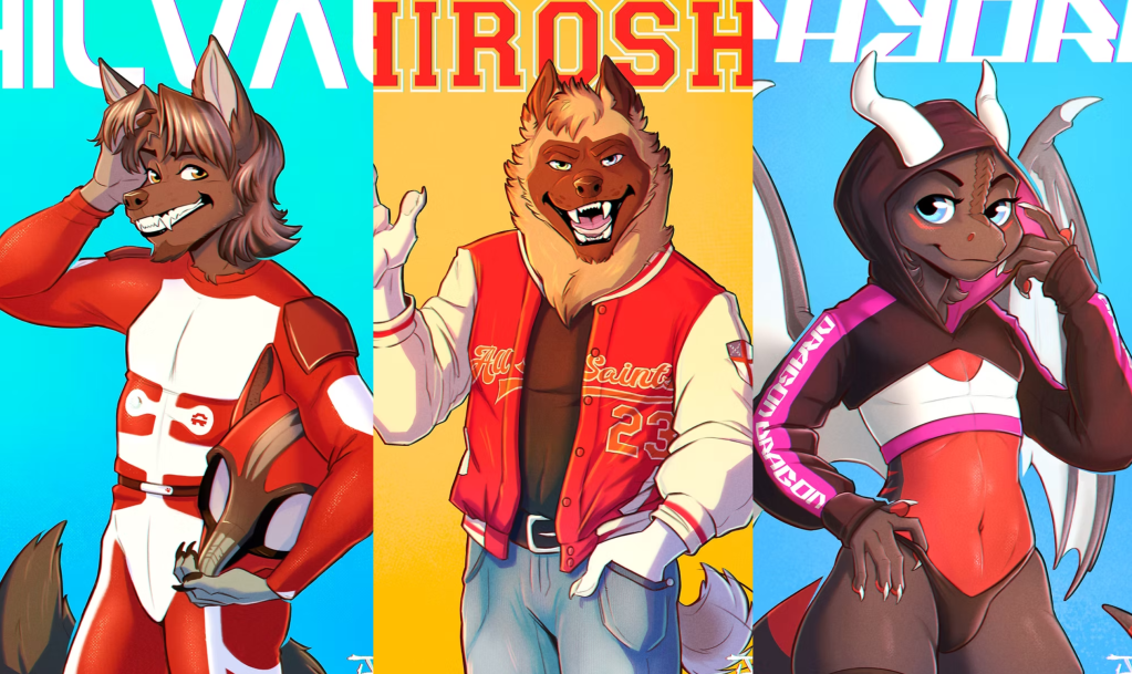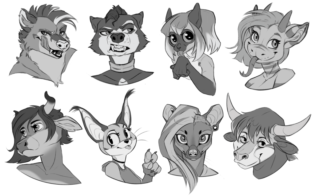 Cell-shaded half-bodies on a simple background, a more detailed background can be requested.